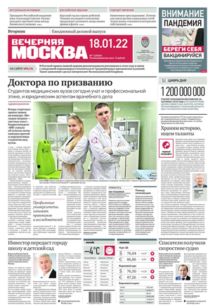 «Вечерняя Москва» — ежедневная российская вечерняя газета, старейшее из вечерних изданий в России, учрежденное в 1923 году. Выходит пять дней в неделю, кроме субботы и воскресенья. Отличается тем, что рассказывает о событиях еще не завершившегося дня. Оперативно освещает хронику и особенности жизни Москвы, охватывает все слои общества и большинство профессиональных и возрастных групп читателей.Издание представлено тремя выпусками – утренним ежедневным, вечерним (выходит три раза в неделю), еженедельным (выходит по четвергам).