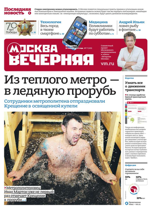 «Вечерняя Москва» — ежедневная российская вечерняя газета, старейшее из вечерних изданий в России, учрежденное в 1923 году. Выходит пять дней в неделю, кроме субботы и воскресенья. Отличается тем, что рассказывает о событиях еще не завершившегося дня. Оперативно освещает хронику и особенности жизни Москвы, охватывает все слои общества и большинство профессиональных и возрастных групп читателей.Издание представлено тремя выпусками – утренним ежедневным, вечерним (выходит три раза в неделю), еженедельным (выходит по четвергам).