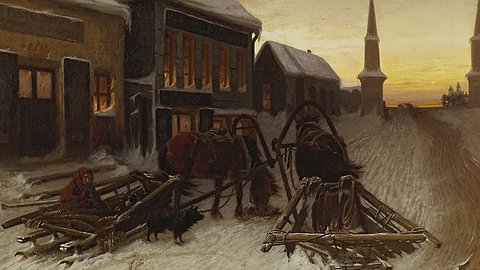 «Последний кабак у заставы», написанный тогда же, что и «Сцена у железной дороги», в 1868-м, не похож ни на одну другую картину Перова. Это такая жанровая сцена, в которой протагонистом становится пейзаж — ему поручена главная трагическая роль, а одушевленные действующие лица, две савраски, жучка и совсем окоченевшая в розвальнях девчушка, дожидающаяся загулявшего возницу, становятся его частью на правах статистов. Малый голландец непременно выпустил бы из кабака какого-нибудь пьянчужку, чтобы тот поскользнулся во тьме на обледенелых ступенях, но Перов, большой мастер рассказывать анекдоты, смиряет себя, становясь на горло собственной песне: вся его композиция — один минус-прием. Повествование оставлено за кадром — или, вернее, отправлено в «вертеп разврата»: алкоголический текст россики и русской литературы прячется где-то там, внутри, за окнами, весело горящими адскими огнями. Только пейзаж, атмосфера, колорит — все, что было слабым местом Перова,— говорят о беспросветности дороги, уходящей в закатную мглу, в никуда, в «Проводы покойника». Той дороги, что четверть века спустя продолжится левитановской «Владимиркой».