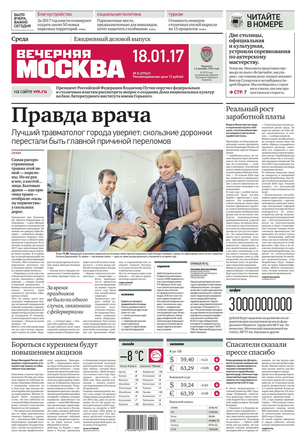«Вечерняя Москва» — ежедневная российская вечерняя газета, старейшее из вечерних изданий в России, учрежденное в 1923 году. Выходит пять дней в неделю, кроме субботы и воскресенья. Отличается тем, что рассказывает о событиях еще не завершившегося дня. Оперативно освещает хронику и особенности жизни Москвы, охватывает все слои общества и большинство профессиональных и возрастных групп читателей.Издание представлено тремя выпусками – утренним ежедневным, вечерним (выходит три раза в неделю), еженедельным (выходит по четвергам).